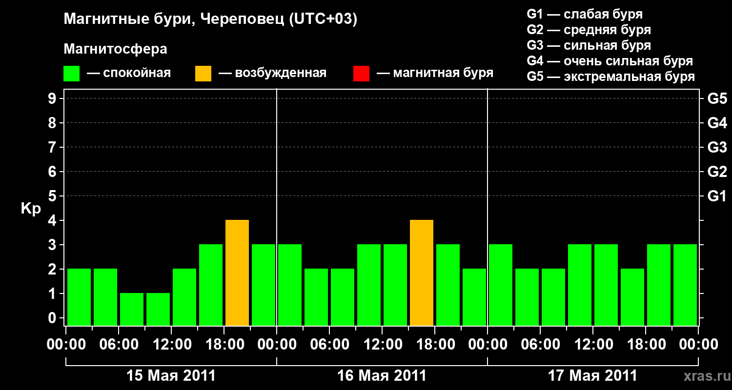 Изменения геомагнитного индекса Kp с 15 по 17 мая 2011 года для средних широт