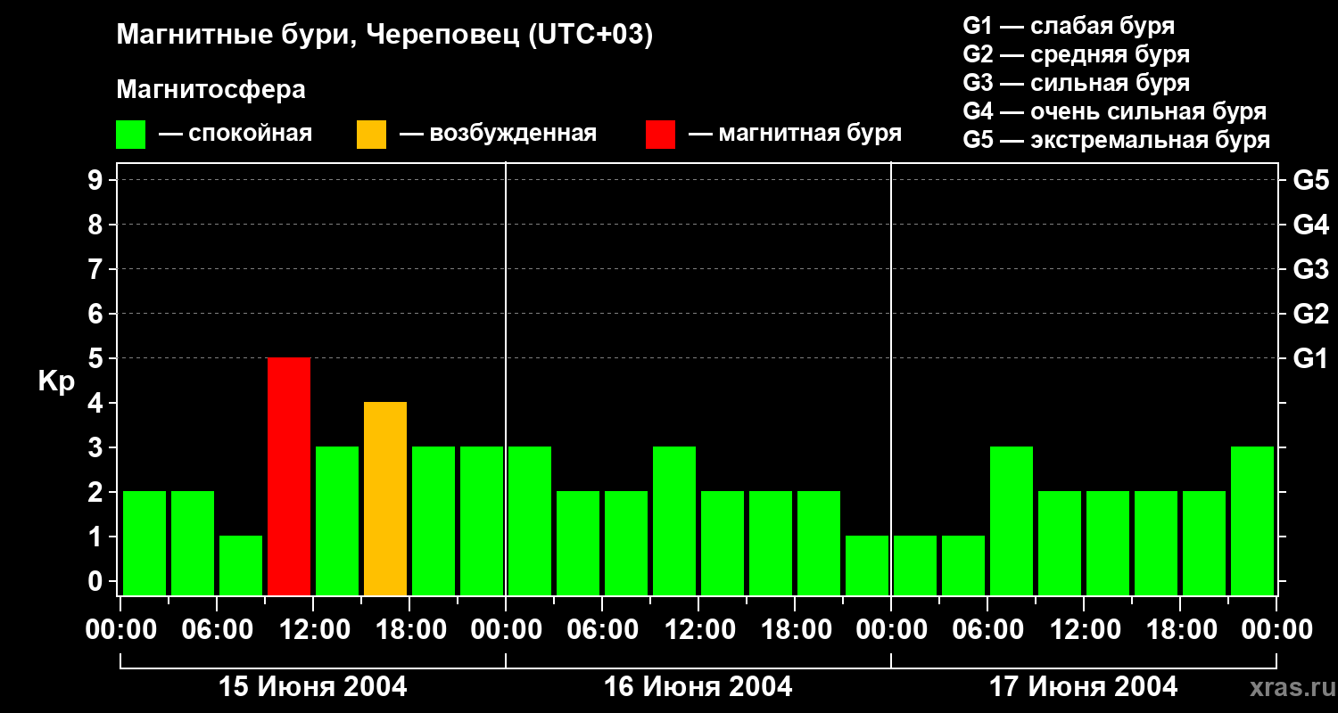 Изменения геомагнитного индекса Kp с 15 по 17 июня 2004 года для средних широт