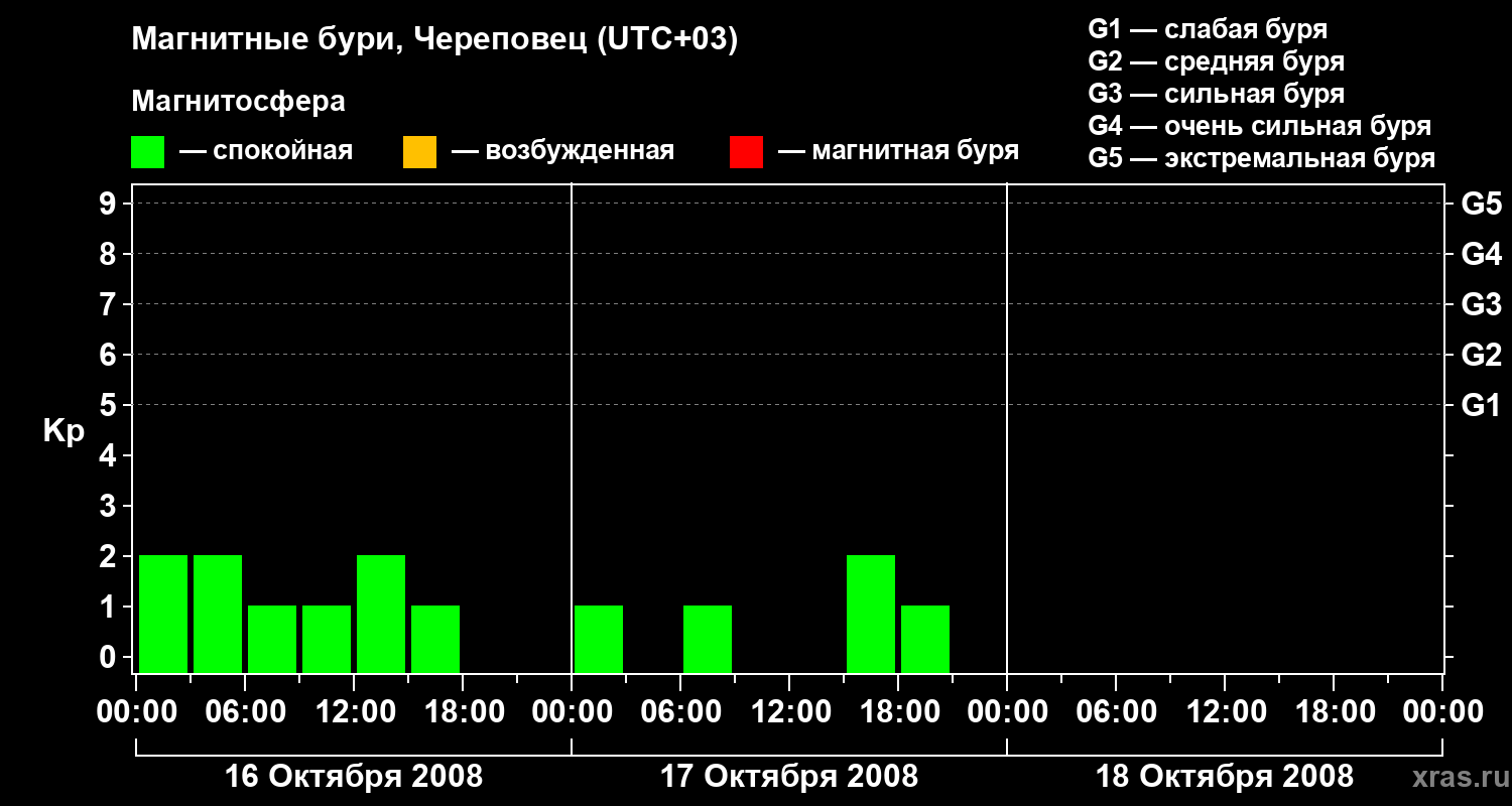 Изменения геомагнитного индекса Kp с 16 по 18 октября 2008 года для средних широт
