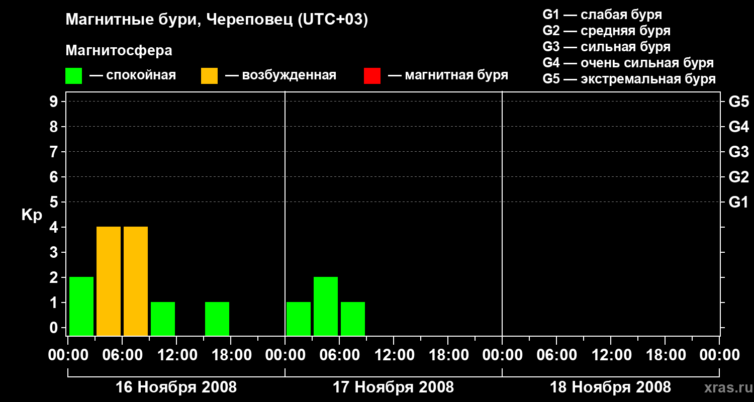 Изменения геомагнитного индекса Kp с 16 по 18 ноября 2008 года для средних широт