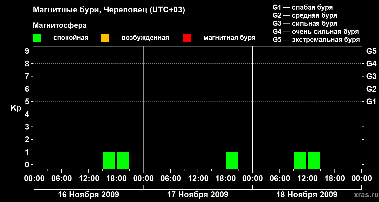Изменения геомагнитного индекса Kp с 16 по 18 ноября 2009 года для средних широт