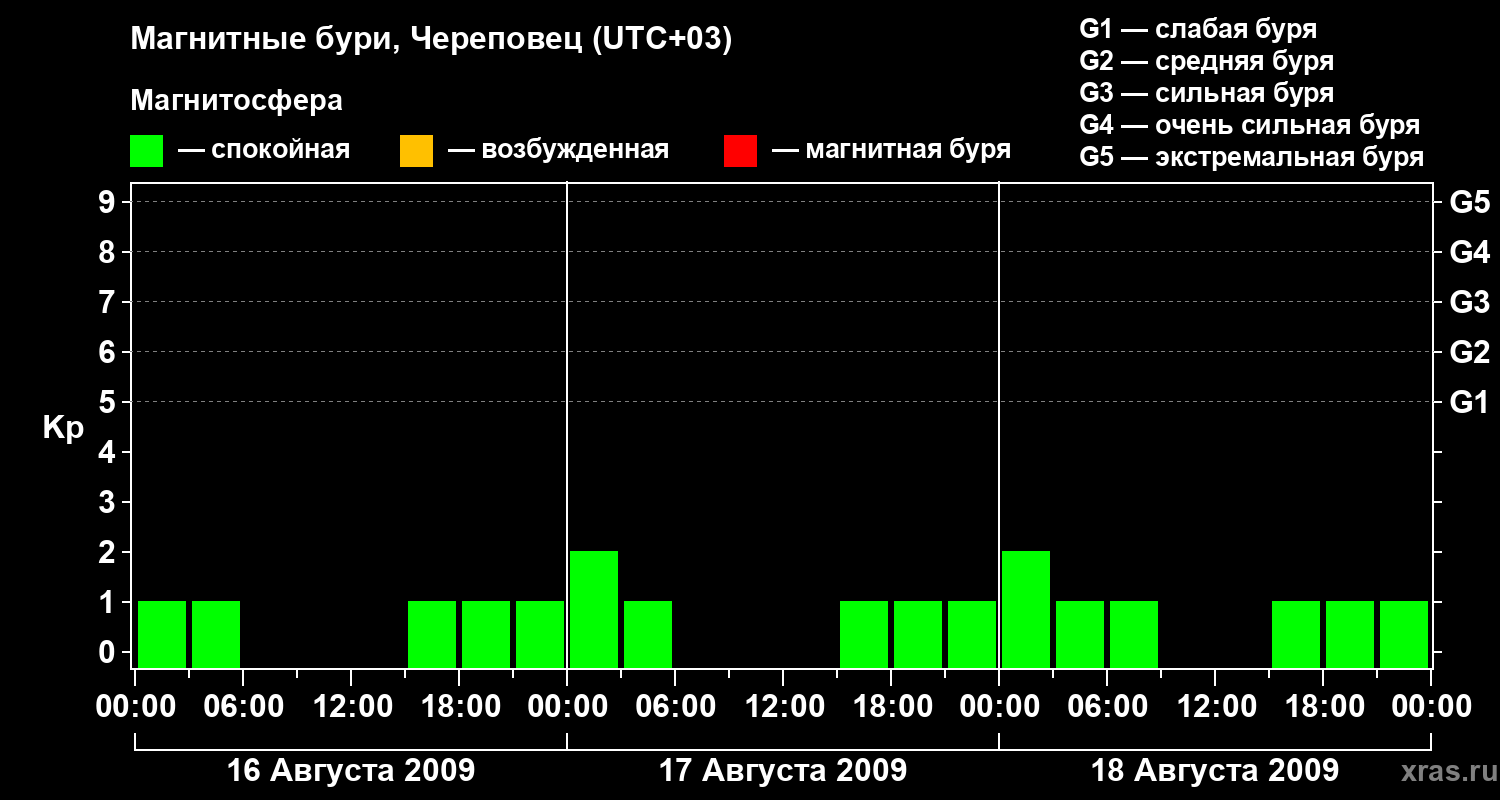 Изменения геомагнитного индекса Kp с 16 по 18 августа 2009 года для средних широт