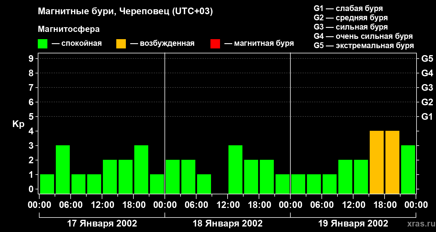 Изменения геомагнитного индекса Kp с 17 по 19 января 2002 года для средних широт