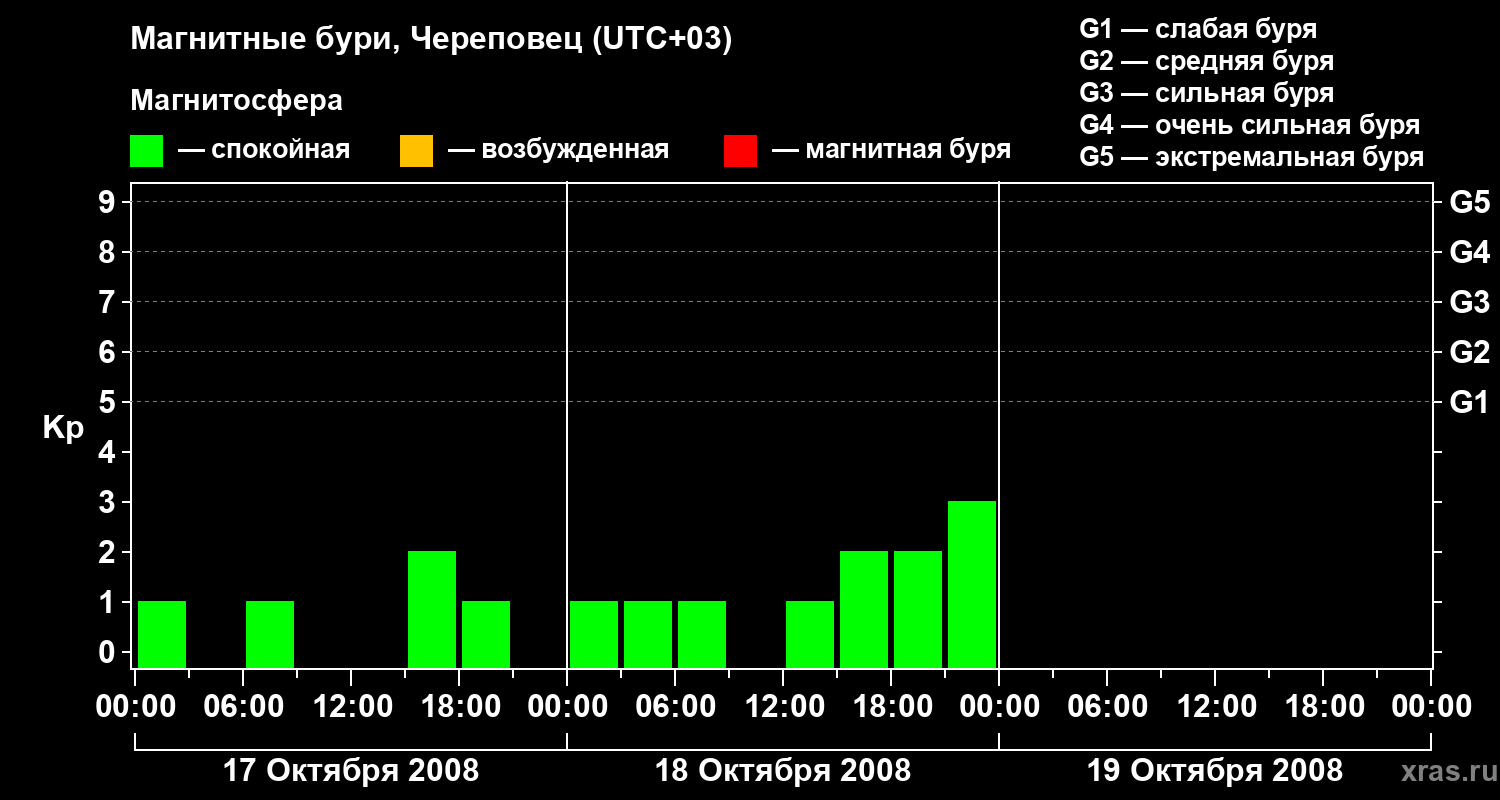 Изменения геомагнитного индекса Kp с 17 по 19 октября 2008 года для средних широт