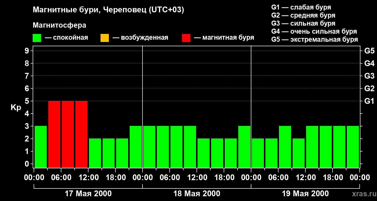 Изменения геомагнитного индекса Kp с 17 по 19 мая 2000 года для средних широт