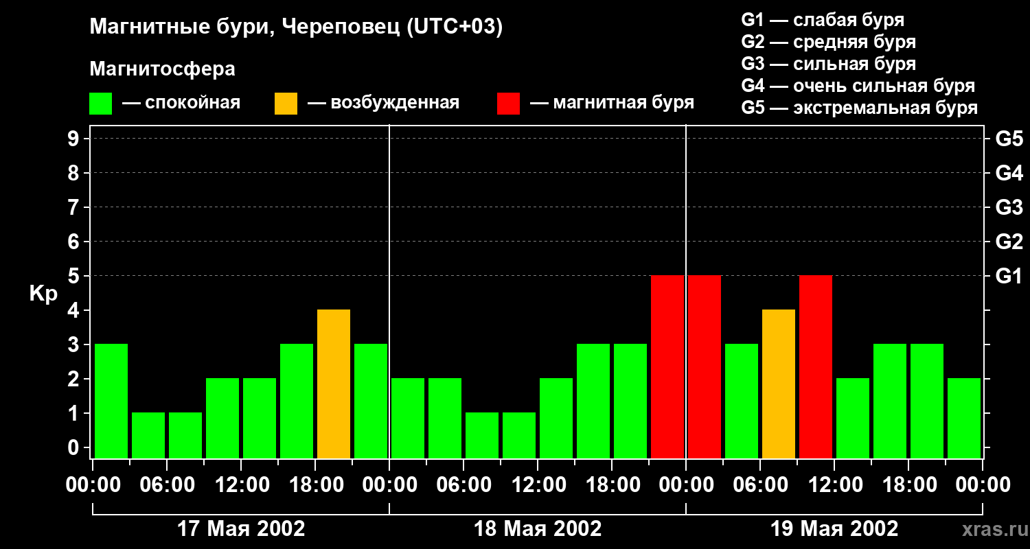 Изменения геомагнитного индекса Kp с 17 по 19 мая 2002 года для средних широт