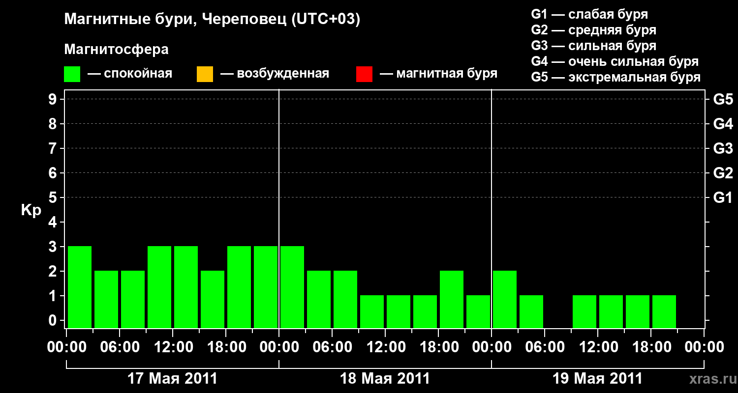 Изменения геомагнитного индекса Kp с 17 по 19 мая 2011 года для средних широт