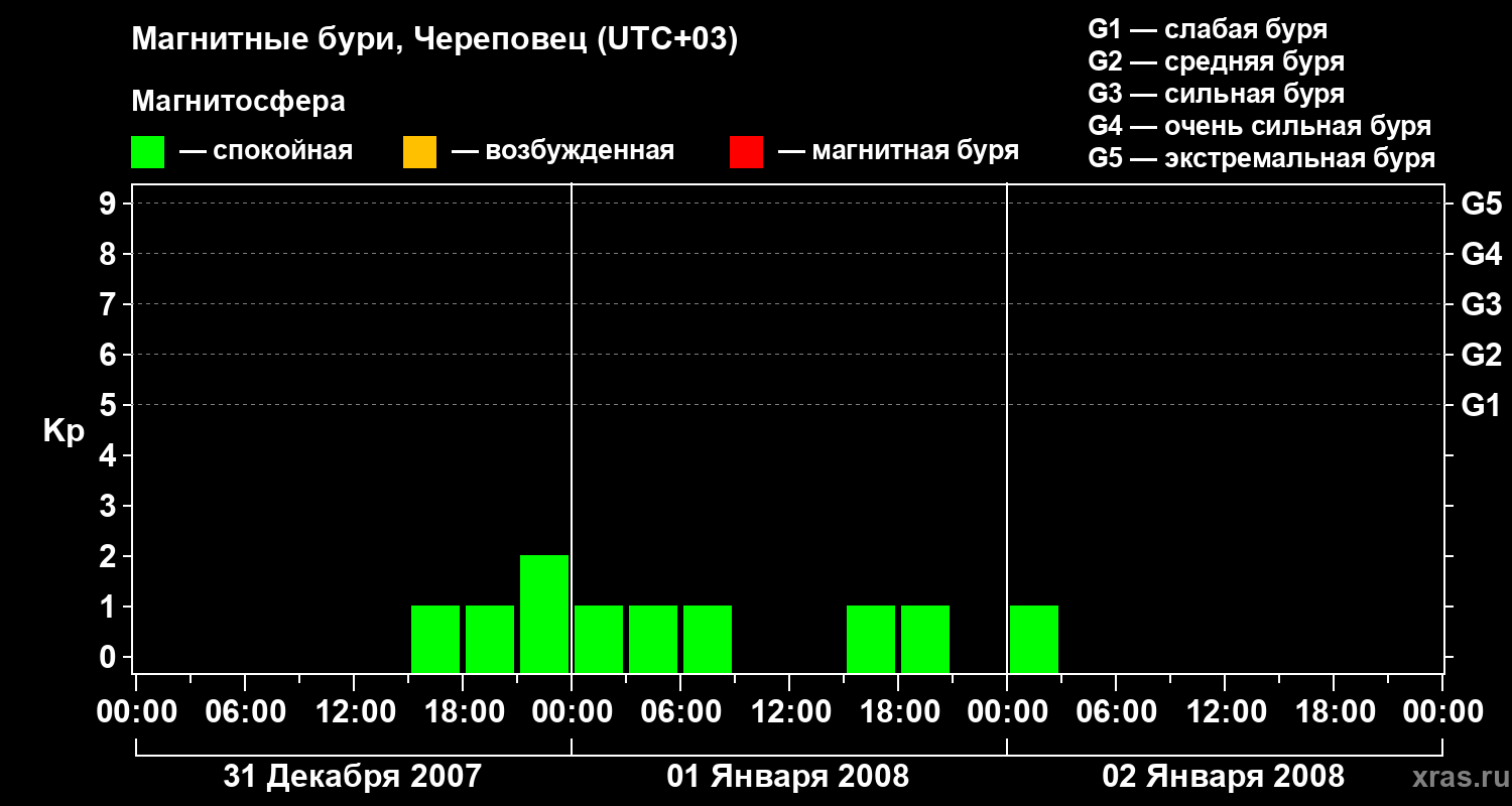 Изменения геомагнитного индекса Kp с 31 декабря 2007 года по 2 января 2008 года для средних широт
