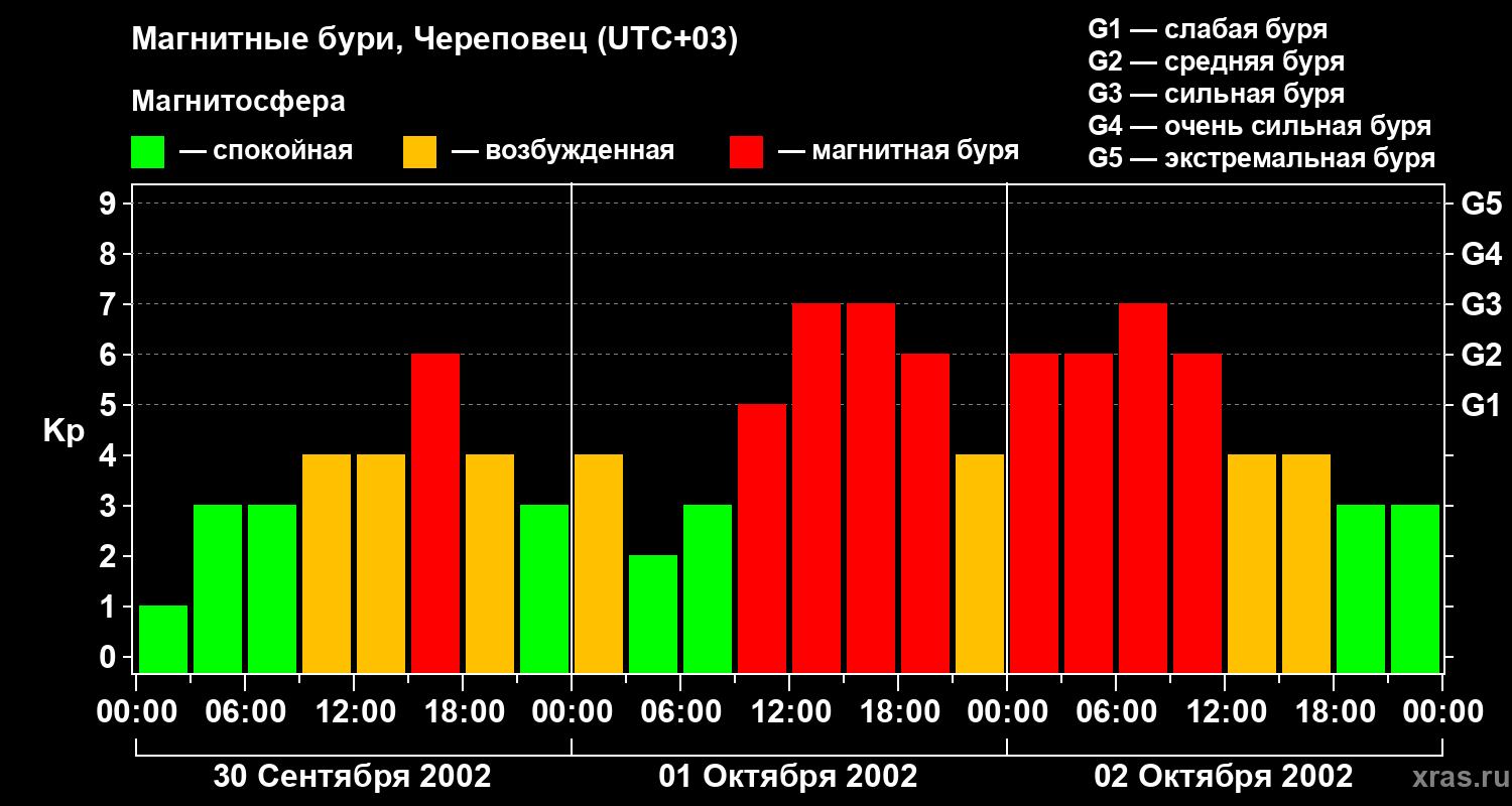 Изменения геомагнитного индекса Kp с 30 сентября по 2 октября 2002 года для средних широт