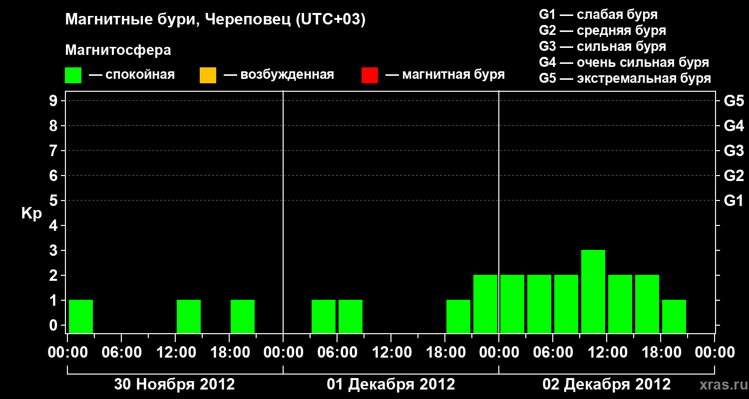 Изменения геомагнитного индекса Kp с 30 ноября по 2 декабря 2012 года для средних широт