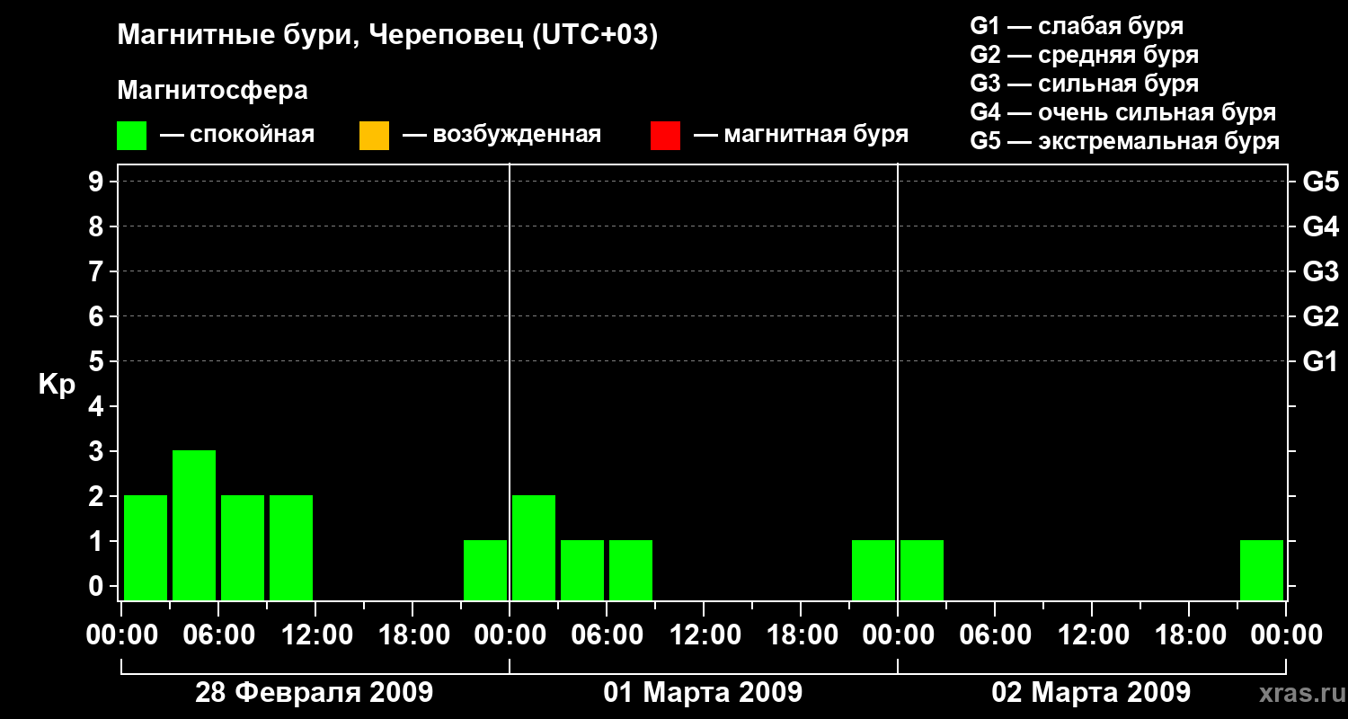 Изменения геомагнитного индекса Kp с 28 февраля по 2 марта 2009 года для средних широт