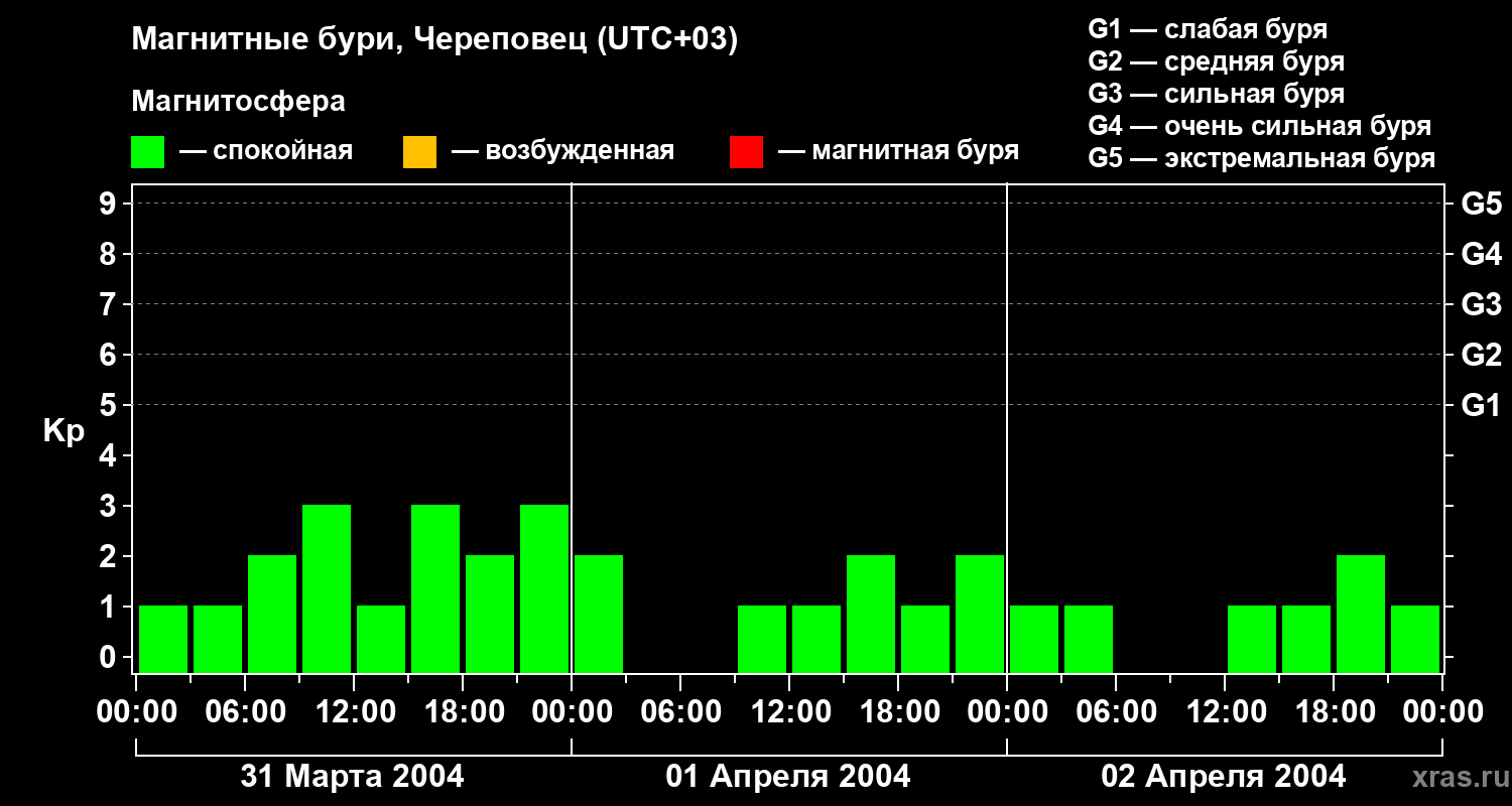 Изменения геомагнитного индекса Kp с 31 марта по 2 апреля 2004 года для средних широт