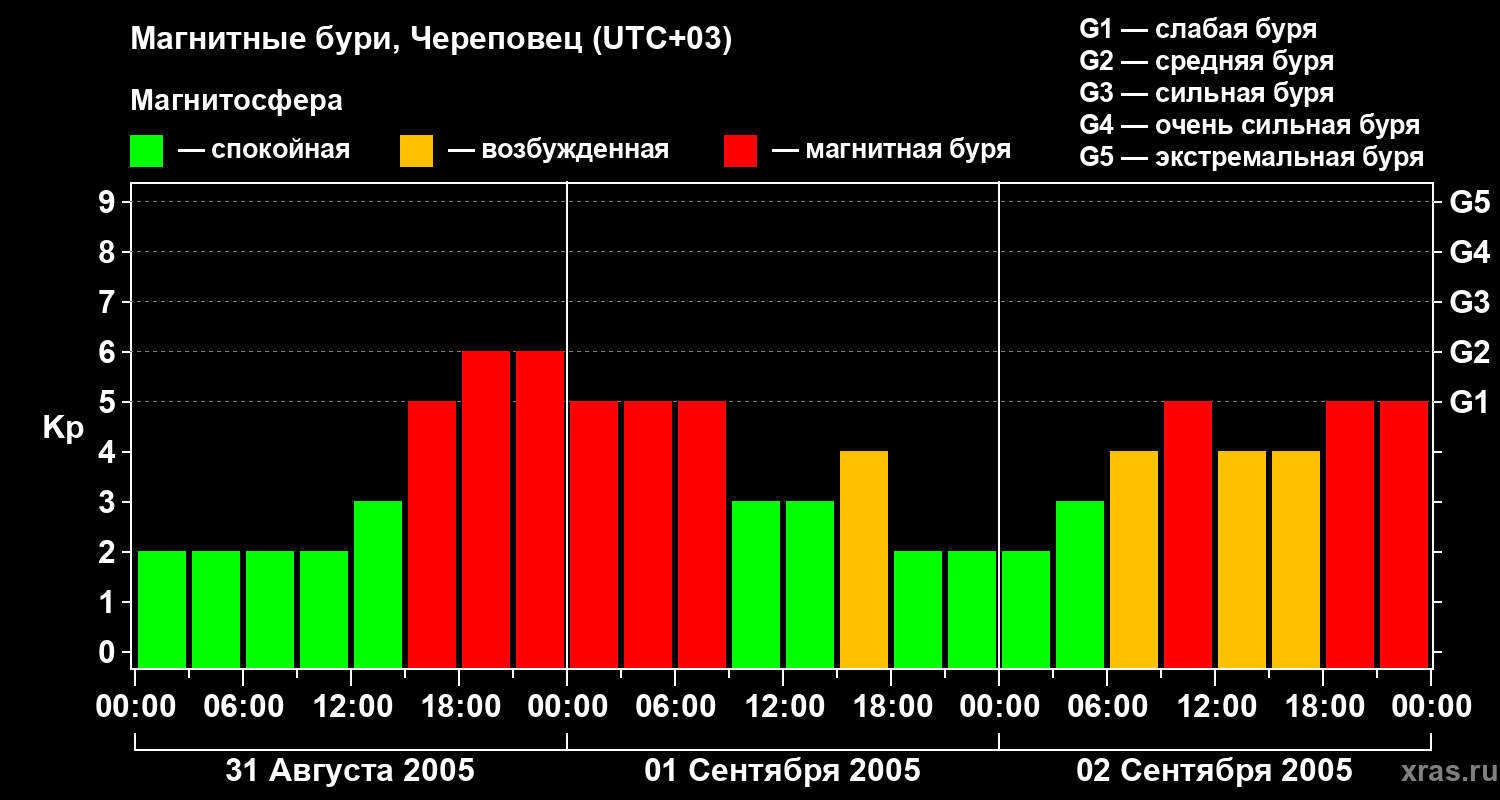 Изменения геомагнитного индекса Kp с 31 августа по 2 сентября 2005 года для средних широт
