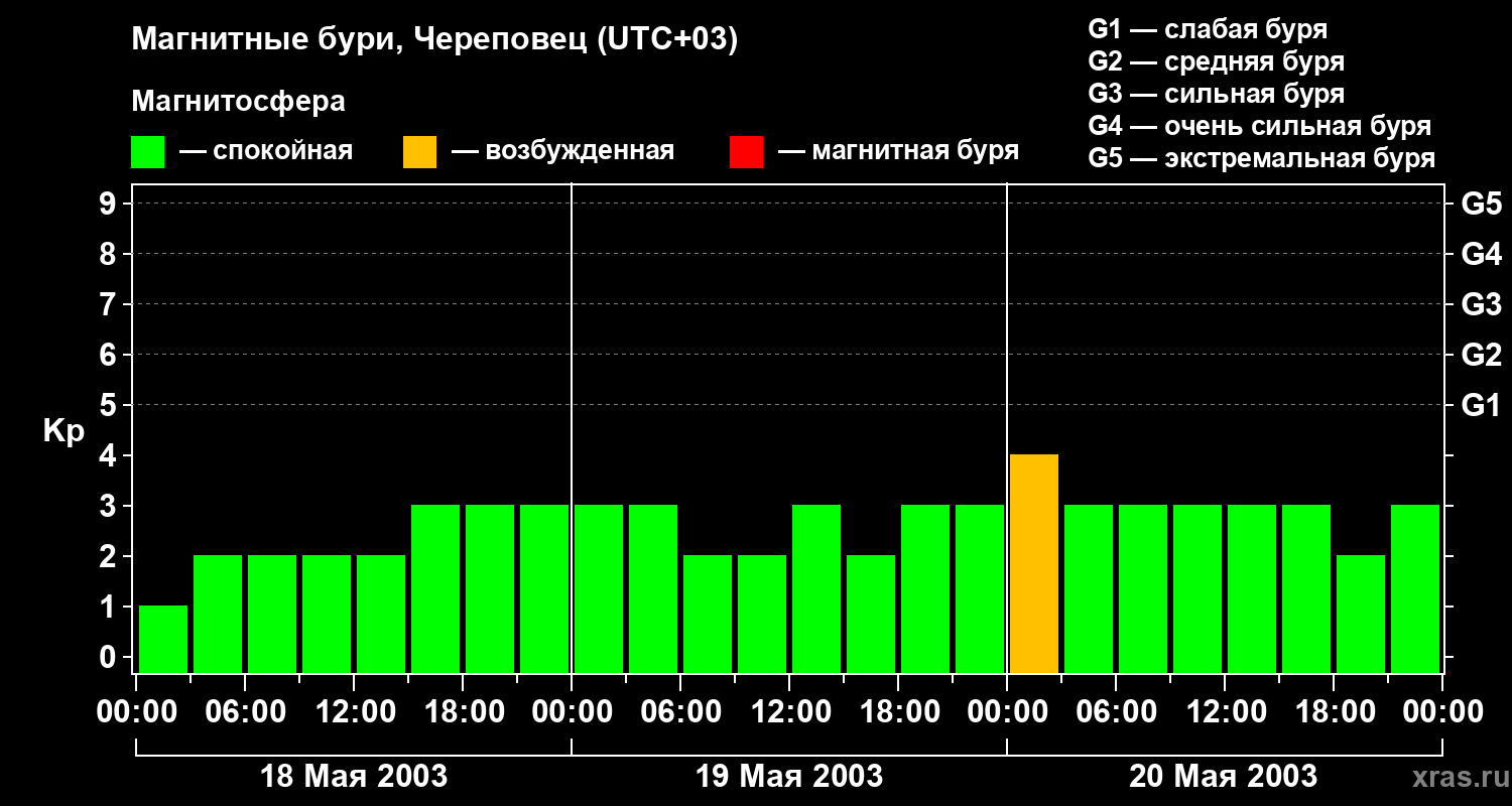 Изменения геомагнитного индекса Kp с 18 по 20 мая 2003 года для средних широт