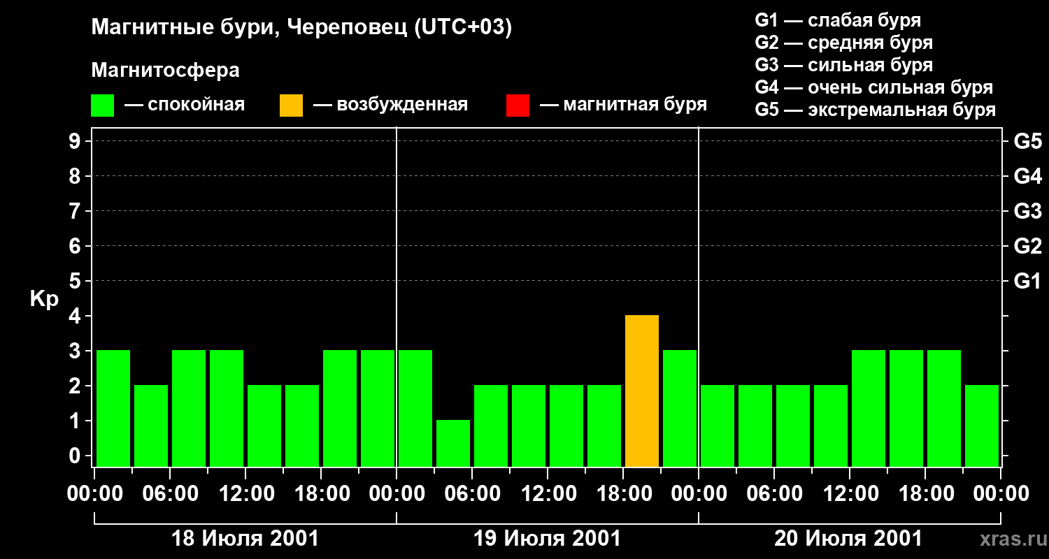 Изменения геомагнитного индекса Kp с 18 по 20 июля 2001 года для средних широт