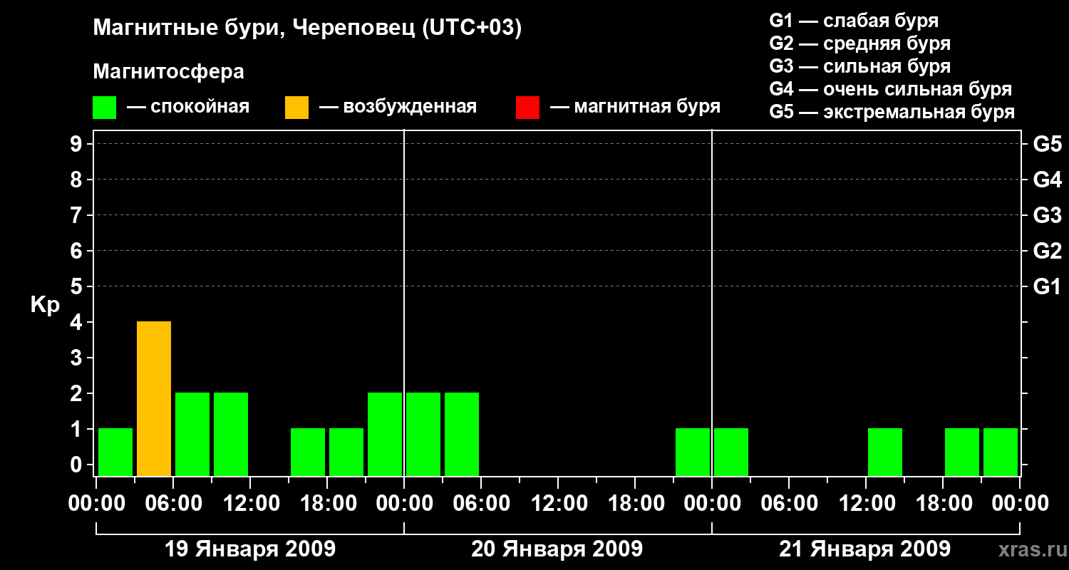 Изменения геомагнитного индекса Kp с 19 по 21 января 2009 года для средних широт
