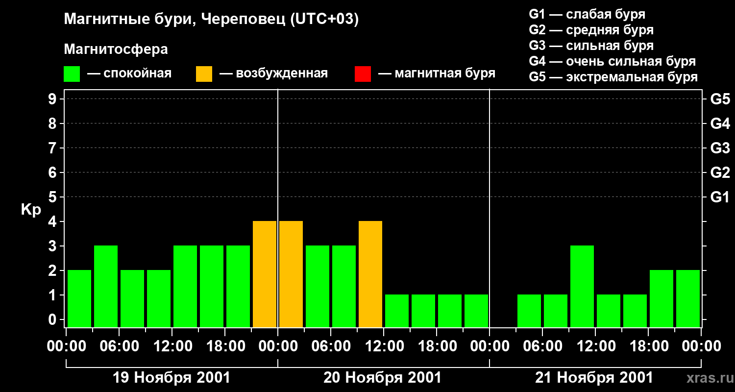 Изменения геомагнитного индекса Kp с 19 по 21 ноября 2001 года для средних широт