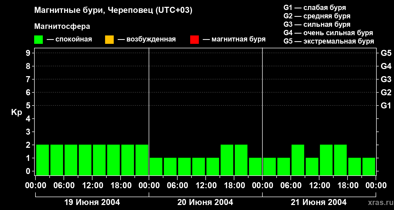 Изменения геомагнитного индекса Kp с 19 по 21 июня 2004 года для средних широт