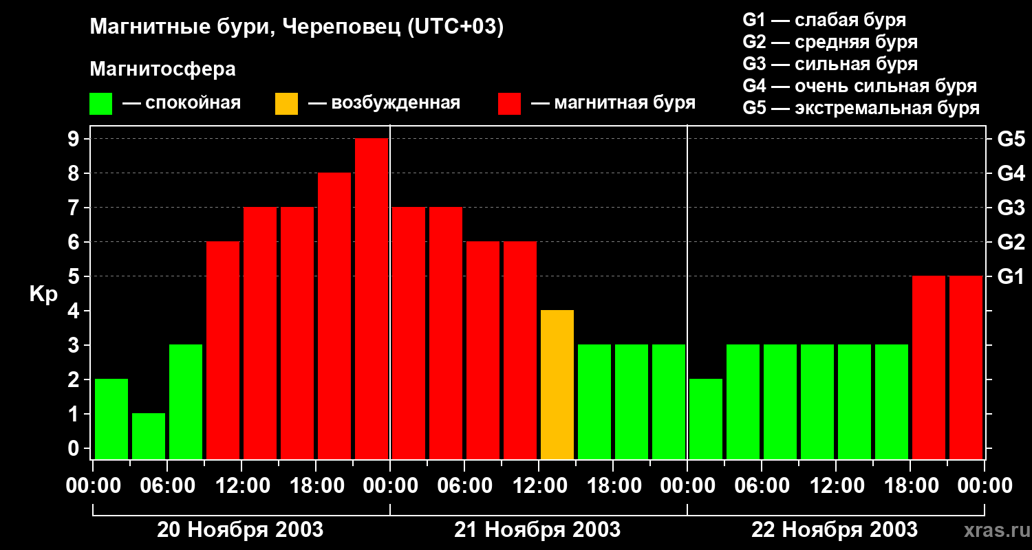 Изменения геомагнитного индекса Kp с 20 по 22 ноября 2003 года для средних широт