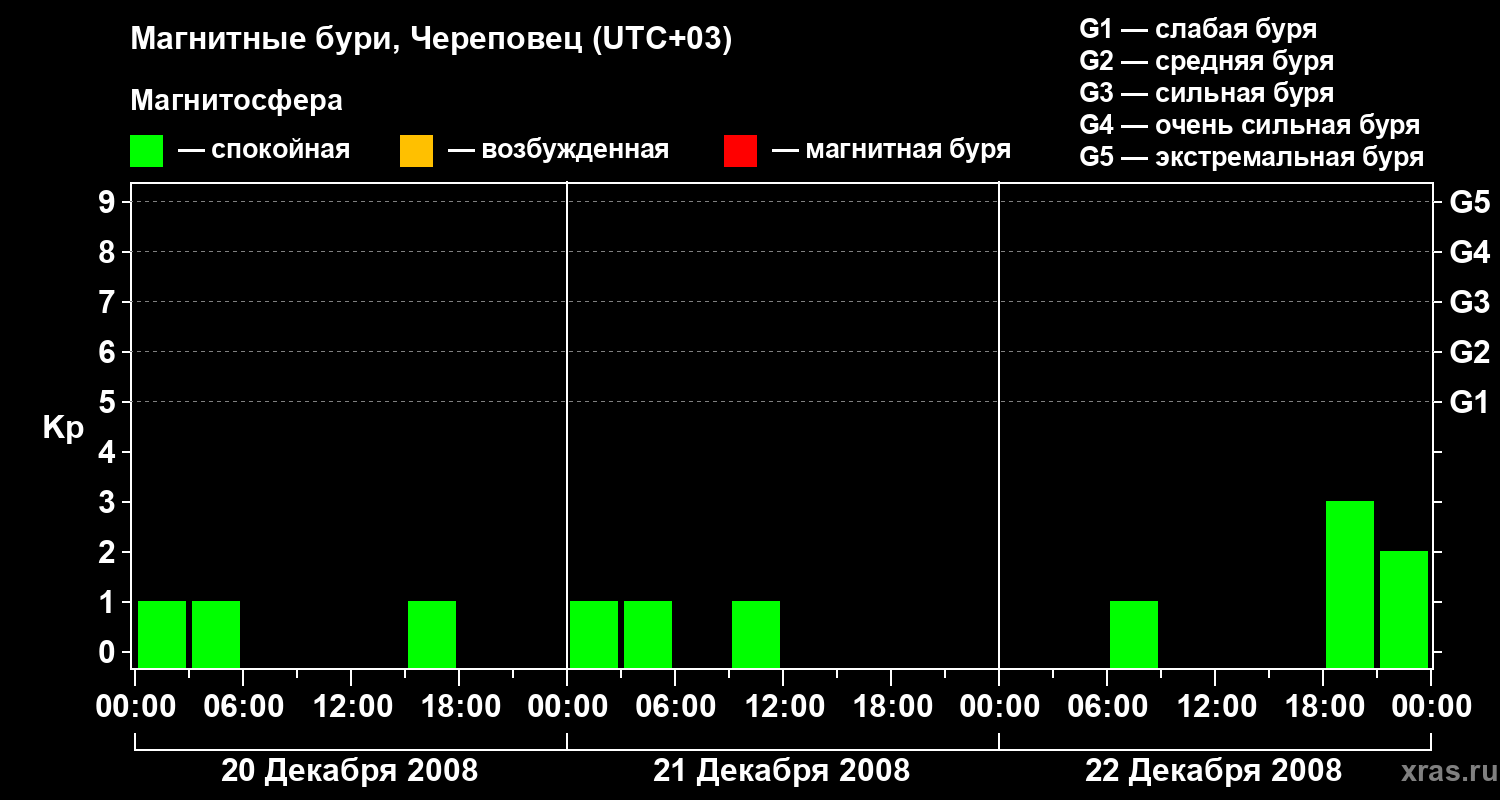 Изменения геомагнитного индекса Kp с 20 по 22 декабря 2008 года для средних широт