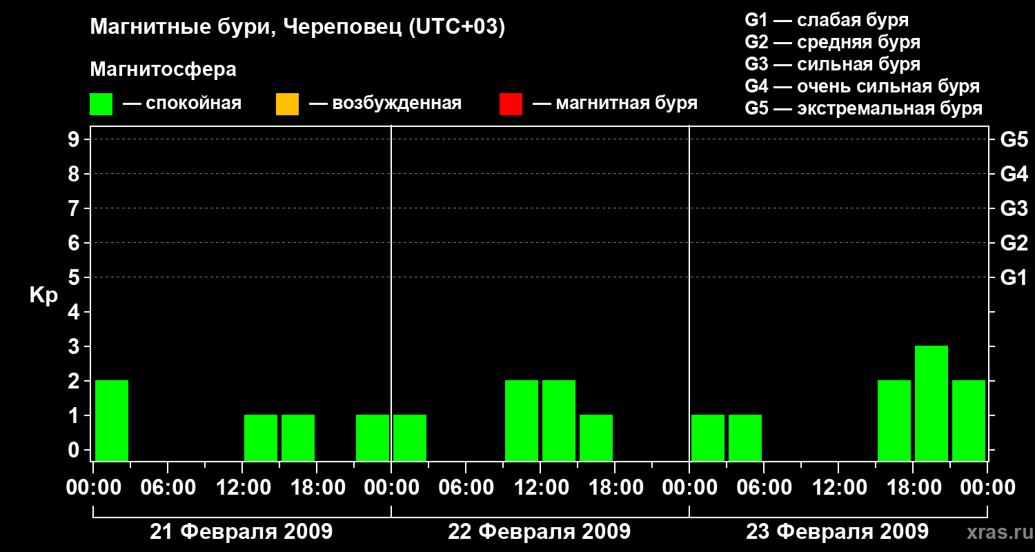 Изменения геомагнитного индекса Kp с 21 по 23 февраля 2009 года для средних широт