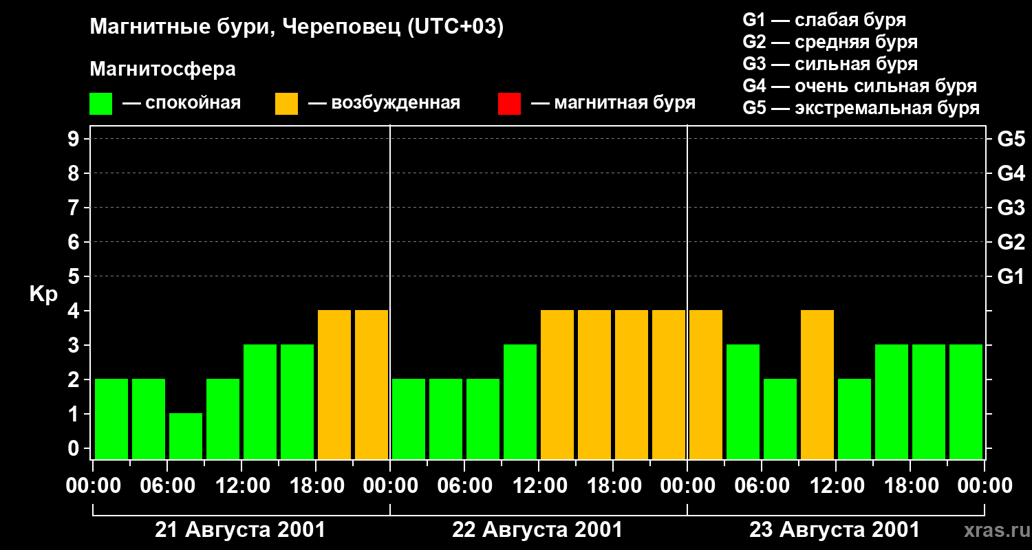 Изменения геомагнитного индекса Kp с 21 по 23 августа 2001 года для средних широт