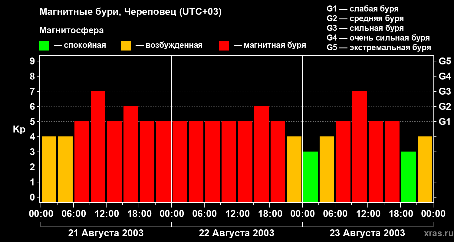 Изменения геомагнитного индекса Kp с 21 по 23 августа 2003 года для средних широт