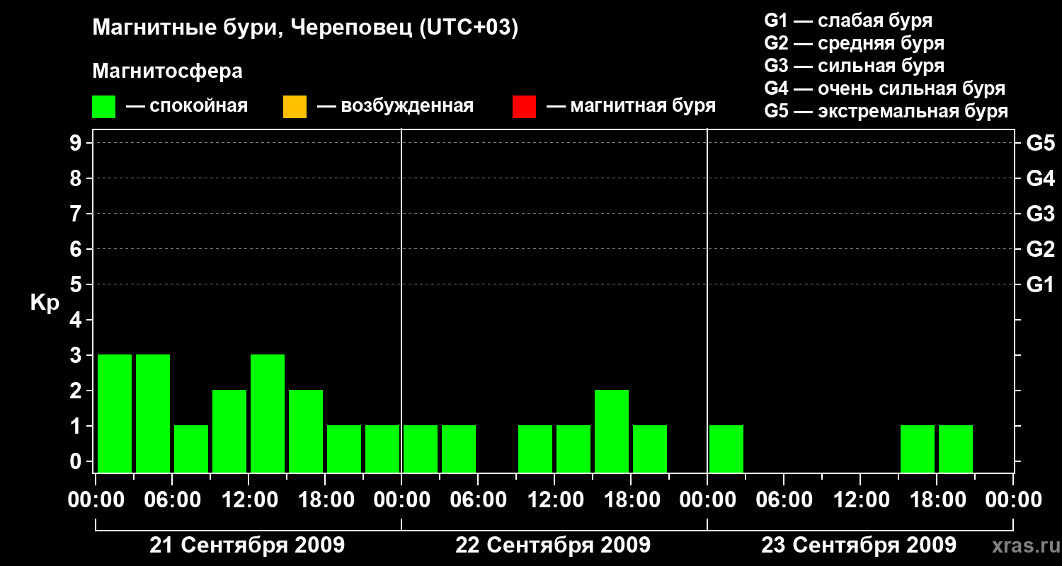 Изменения геомагнитного индекса Kp с 21 по 23 сентября 2009 года для средних широт
