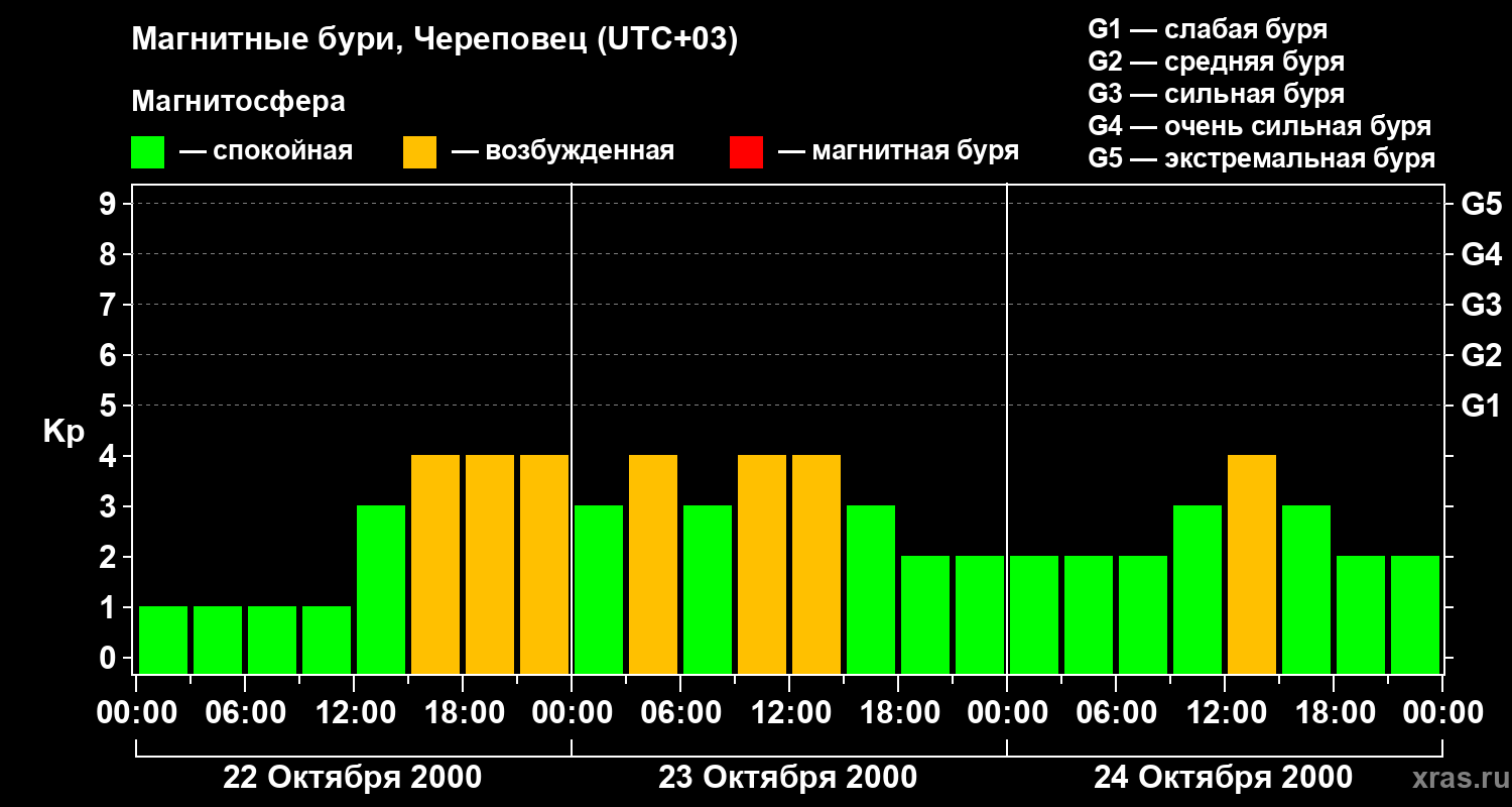 Изменения геомагнитного индекса Kp с 22 по 24 октября 2000 года для средних широт
