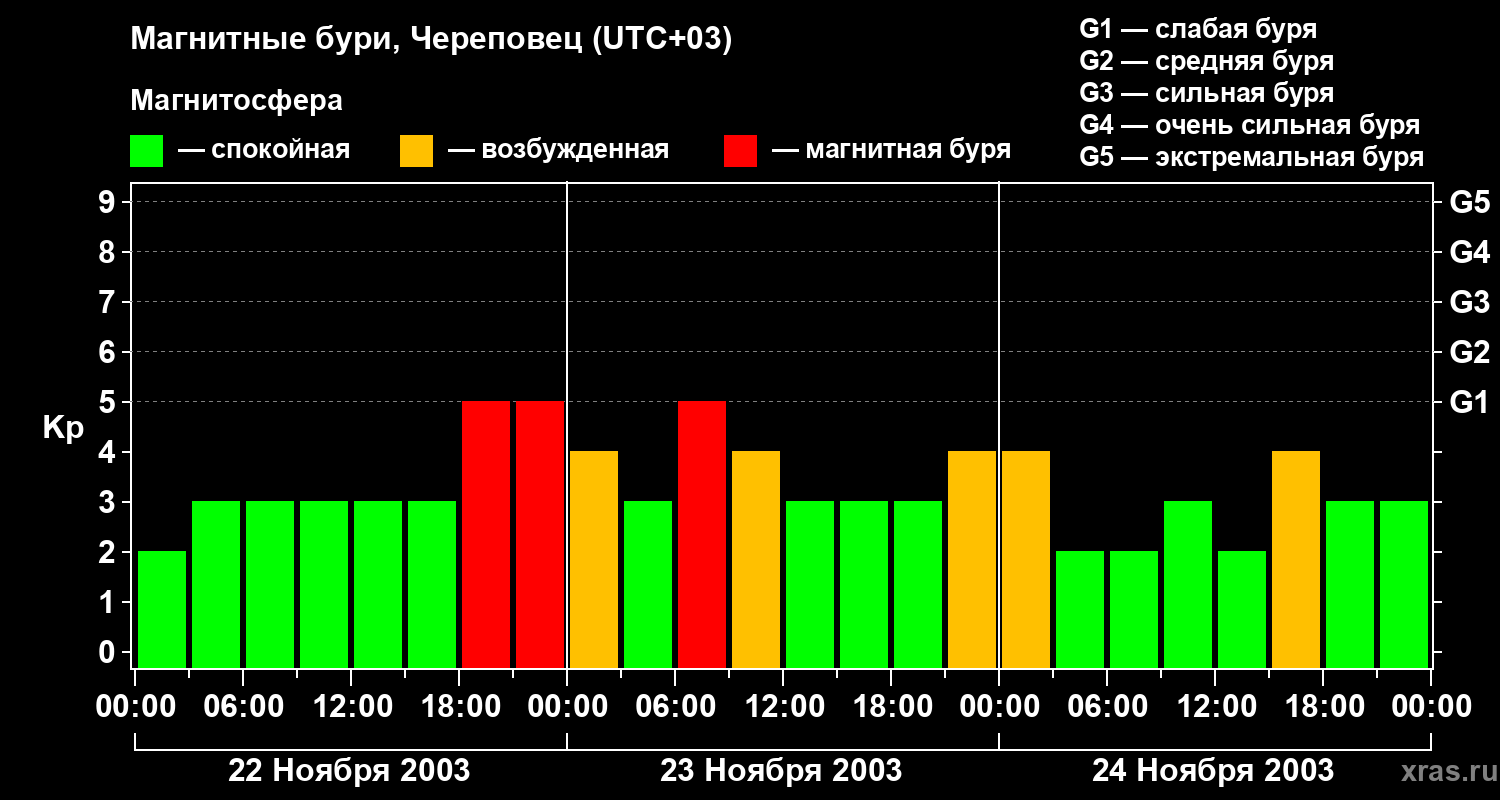 Изменения геомагнитного индекса Kp с 22 по 24 ноября 2003 года для средних широт