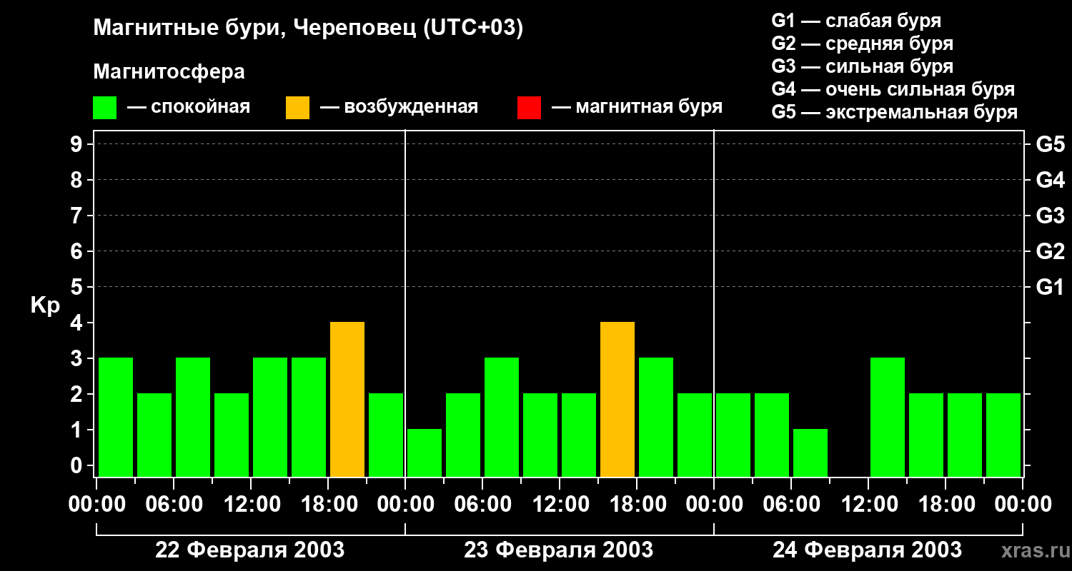 Изменения геомагнитного индекса Kp с 22 по 24 февраля 2003 года для средних широт