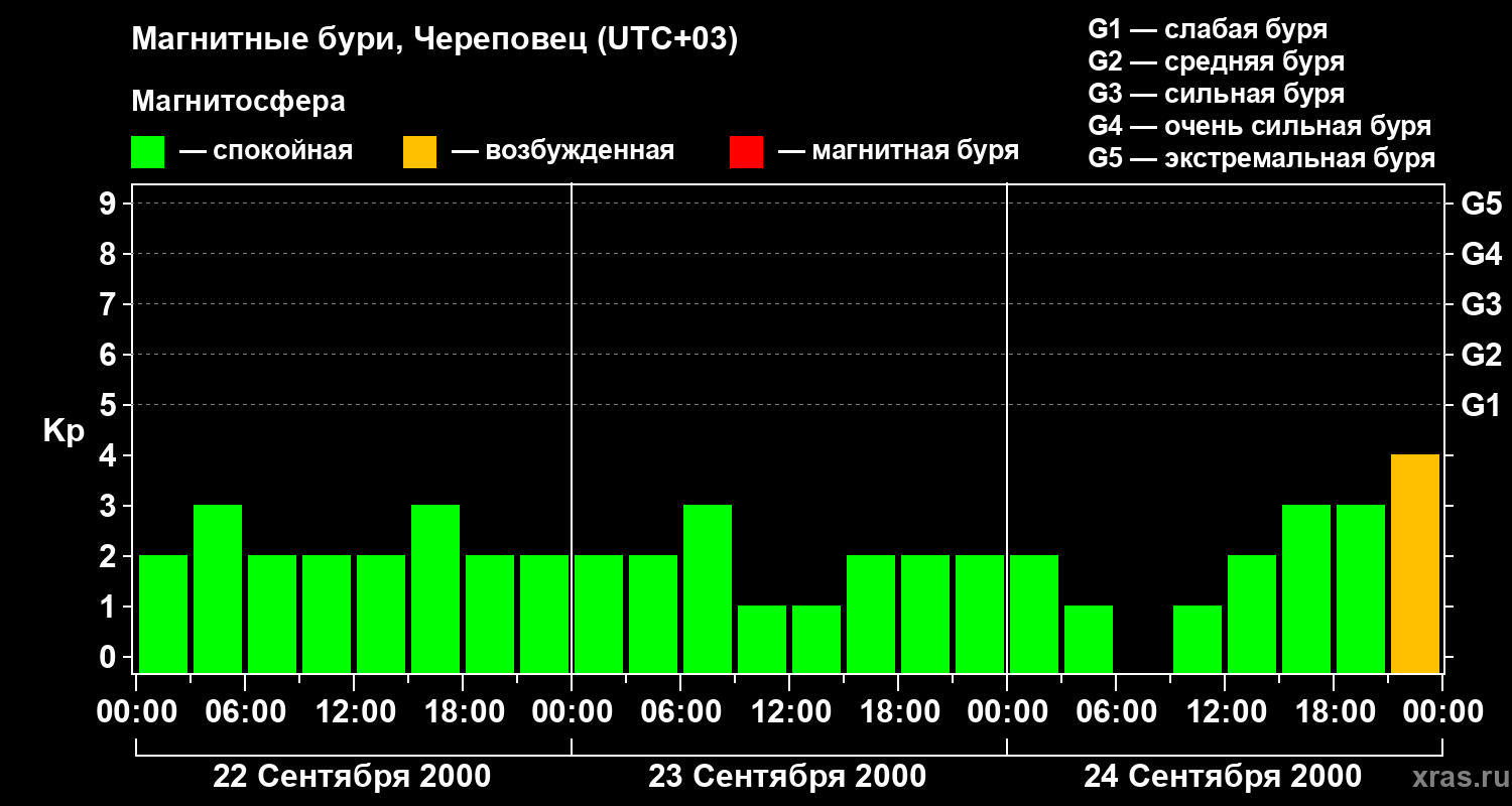 Изменения геомагнитного индекса Kp с 22 по 24 сентября 2000 года для средних широт