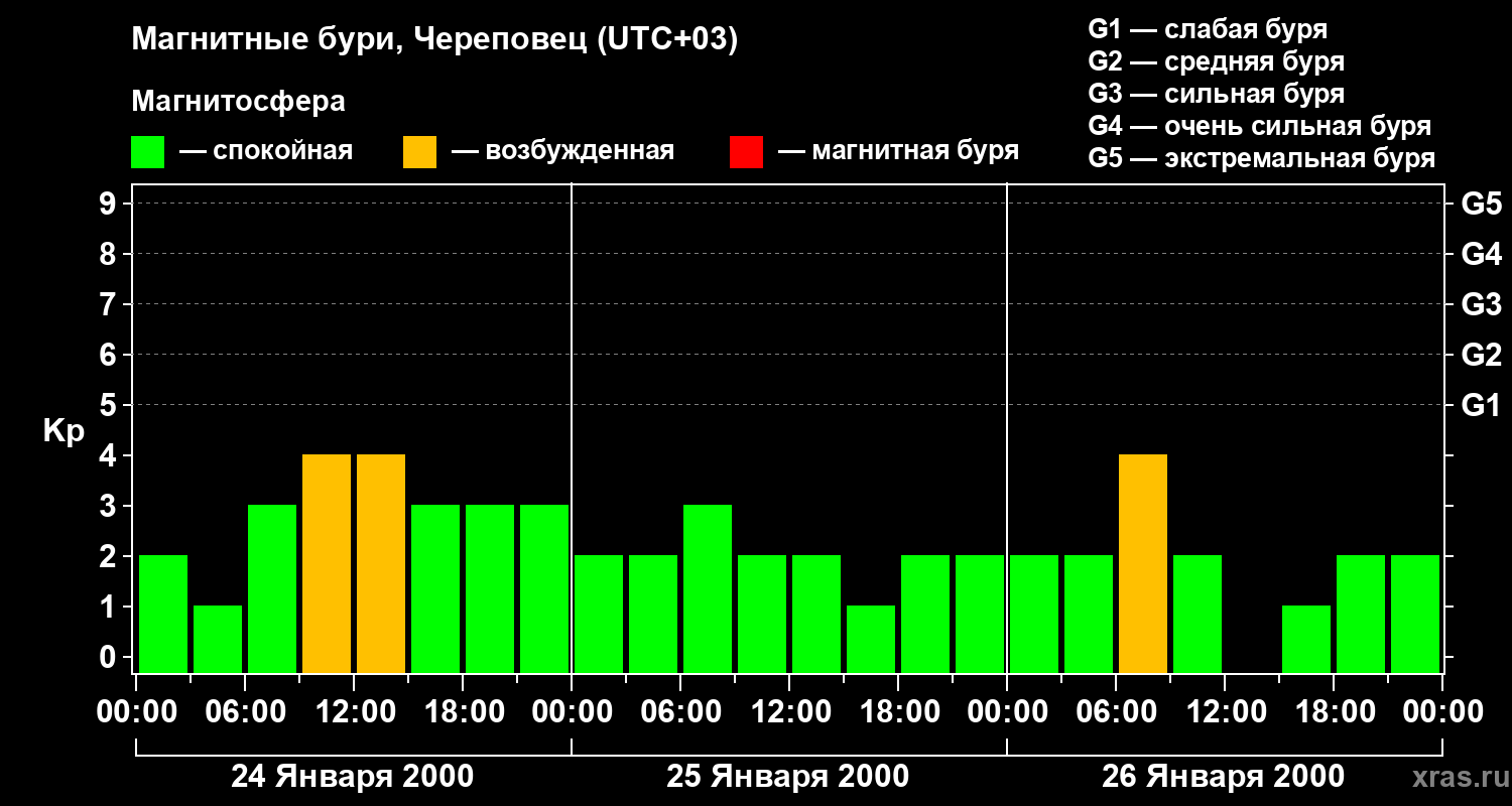 Изменения геомагнитного индекса Kp с 24 по 26 января 2000 года для средних широт