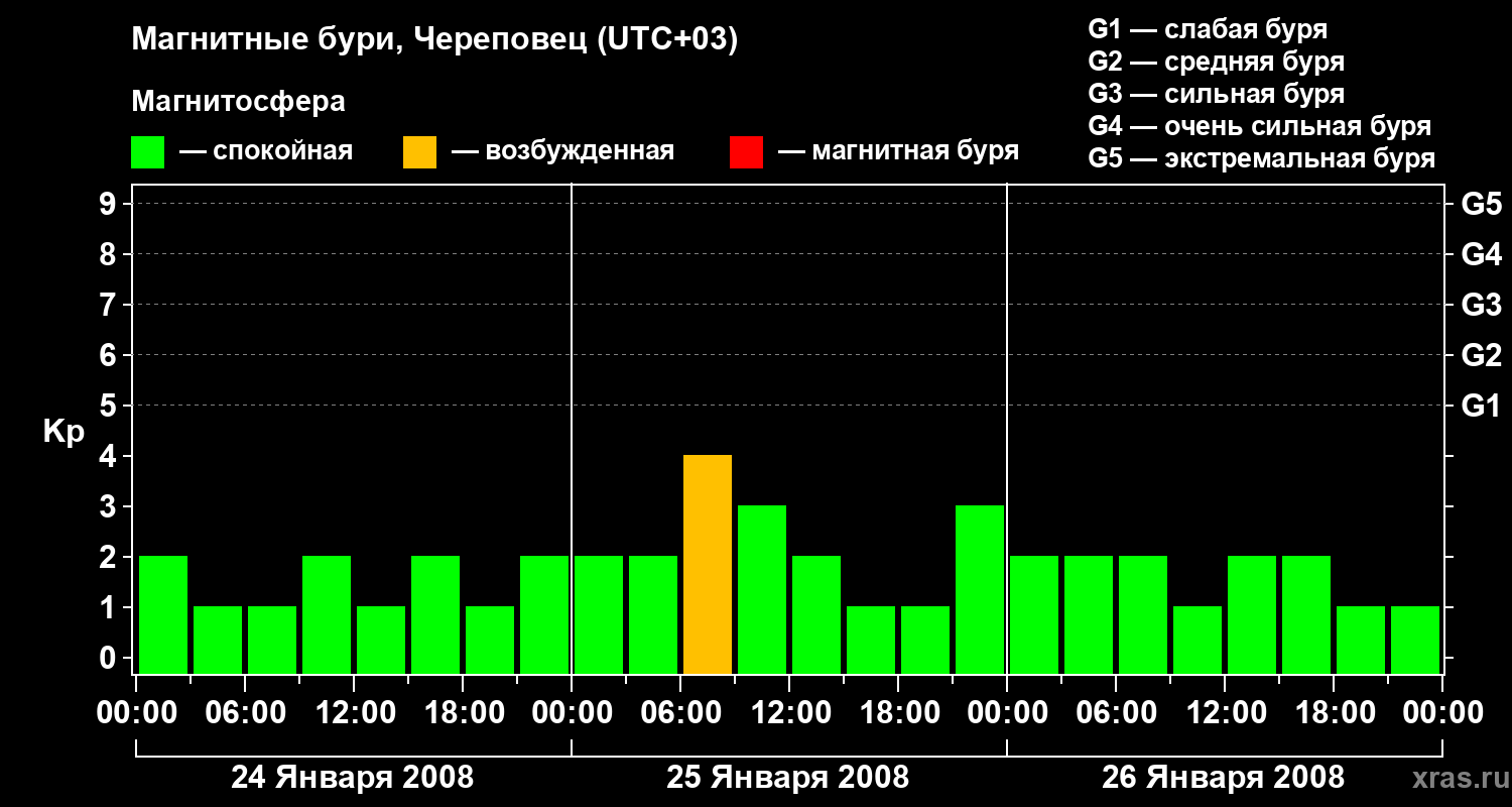 Изменения геомагнитного индекса Kp с 24 по 26 января 2008 года для средних широт