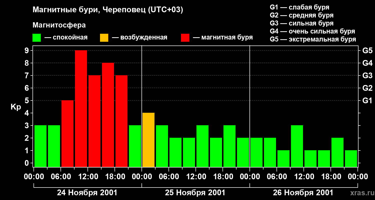 Изменения геомагнитного индекса Kp с 24 по 26 ноября 2001 года для средних широт