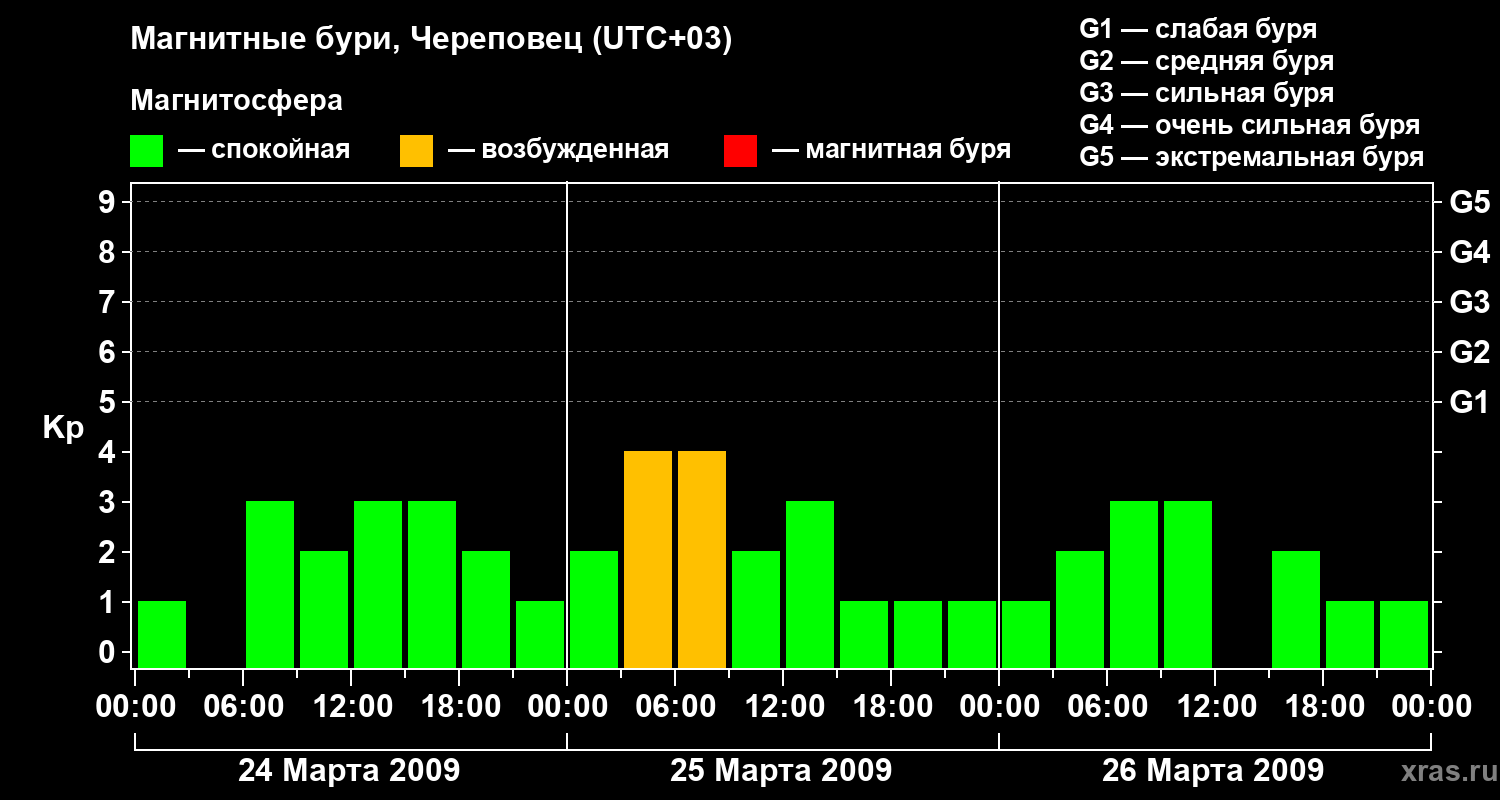 Изменения геомагнитного индекса Kp с 24 по 26 марта 2009 года для средних широт