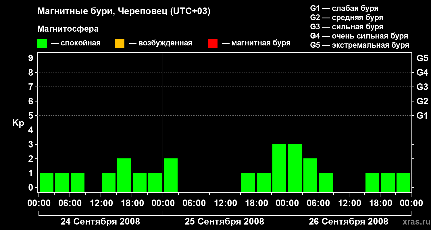 Изменения геомагнитного индекса Kp с 24 по 26 сентября 2008 года для средних широт