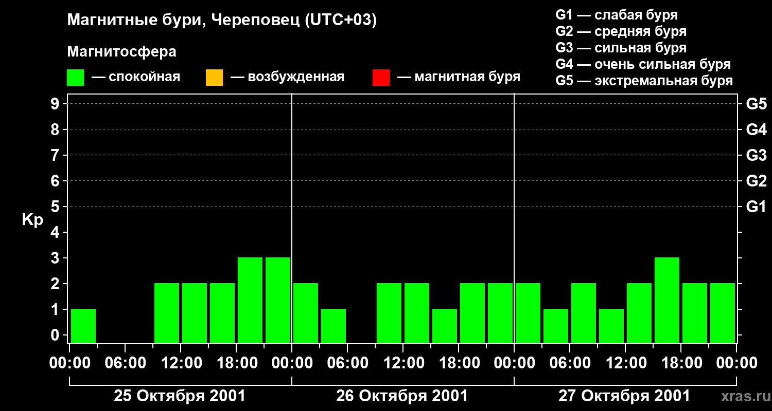 Изменения геомагнитного индекса Kp с 25 по 27 октября 2001 года для средних широт