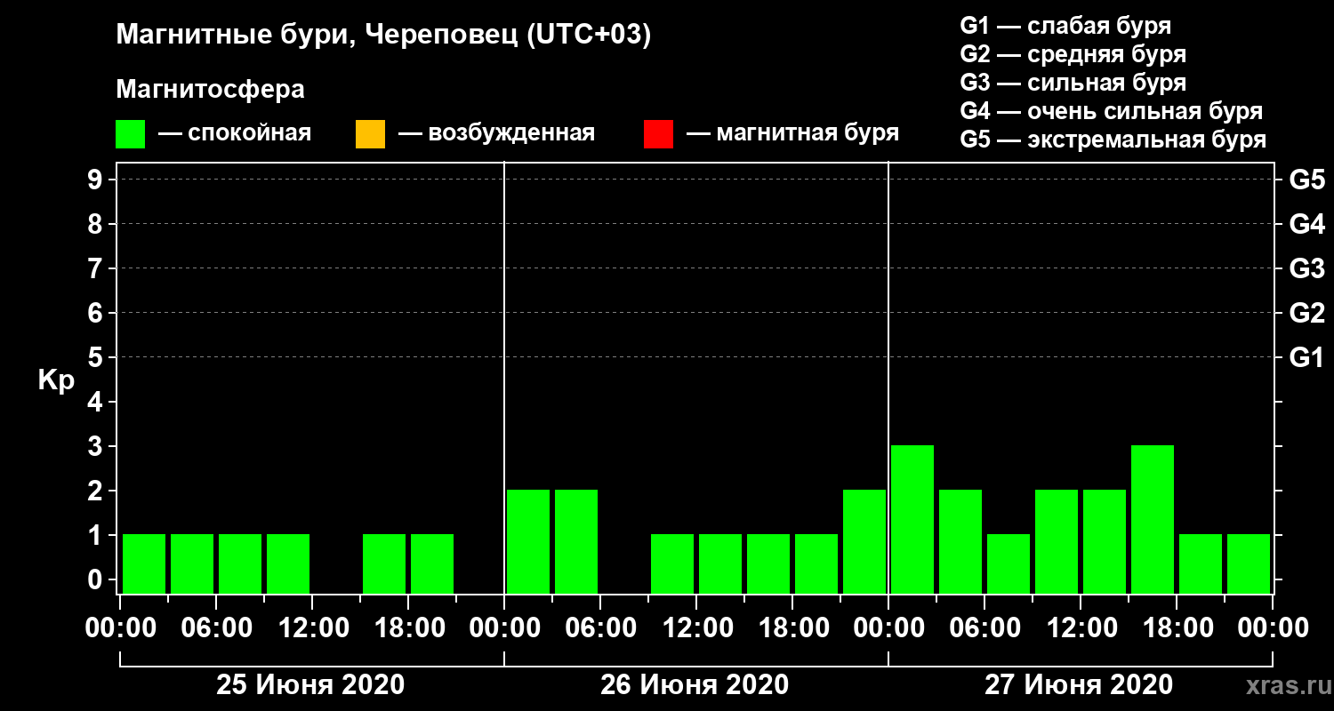 Изменения геомагнитного индекса Kp с 25 по 27 июня 2020 года для средних широт