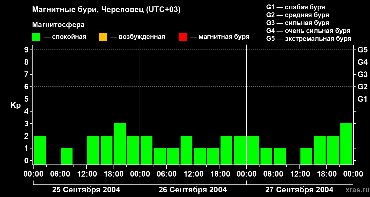 Изменения геомагнитного индекса Kp с 25 по 27 сентября 2004 года для средних широт
