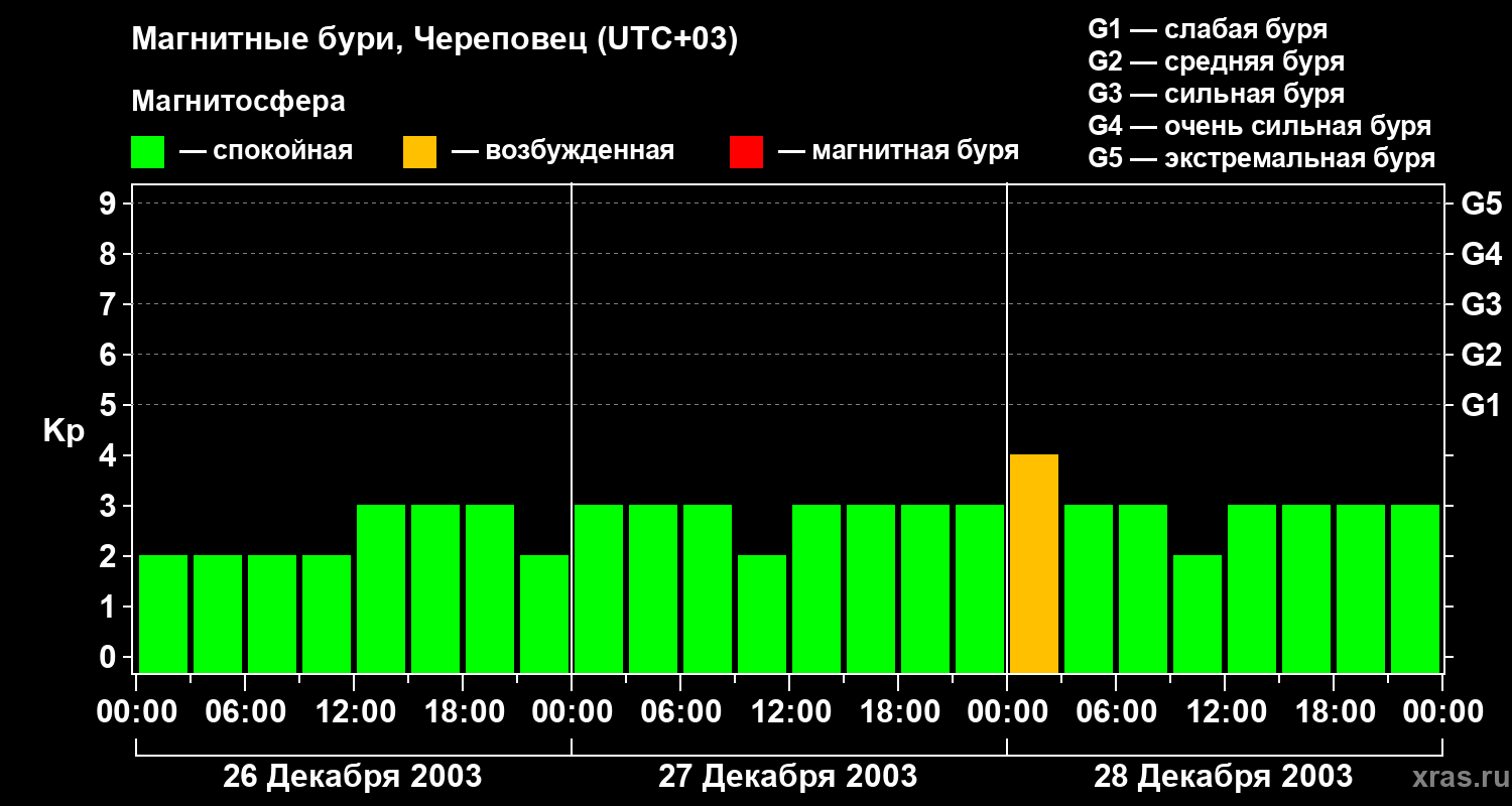 Изменения геомагнитного индекса Kp с 26 по 28 декабря 2003 года для средних широт
