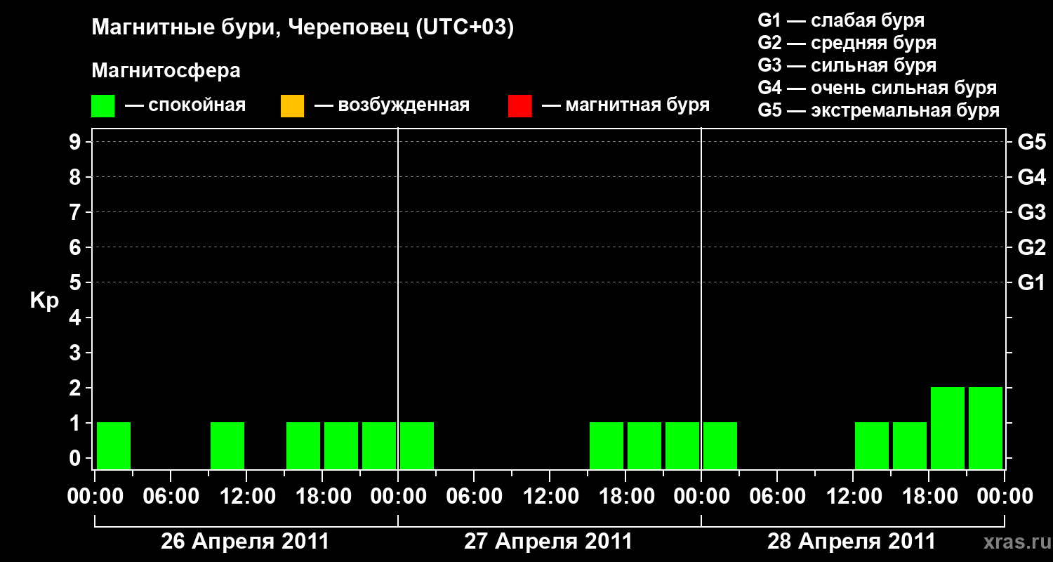 Изменения геомагнитного индекса Kp с 26 по 28 апреля 2011 года для средних широт