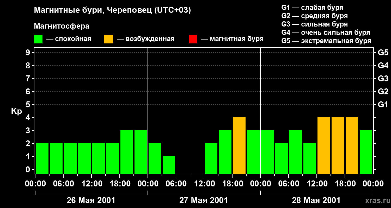 Изменения геомагнитного индекса Kp с 26 по 28 мая 2001 года для средних широт
