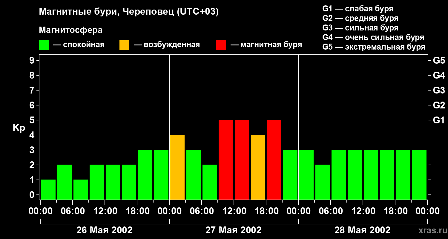 Изменения геомагнитного индекса Kp с 26 по 28 мая 2002 года для средних широт