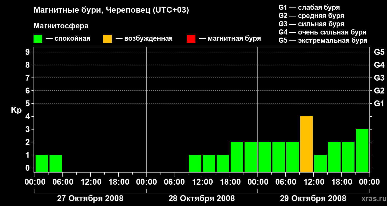 Изменения геомагнитного индекса Kp с 27 по 29 октября 2008 года для средних широт