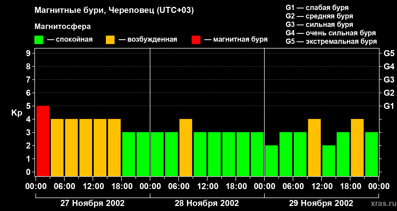Изменения геомагнитного индекса Kp с 27 по 29 ноября 2002 года для средних широт