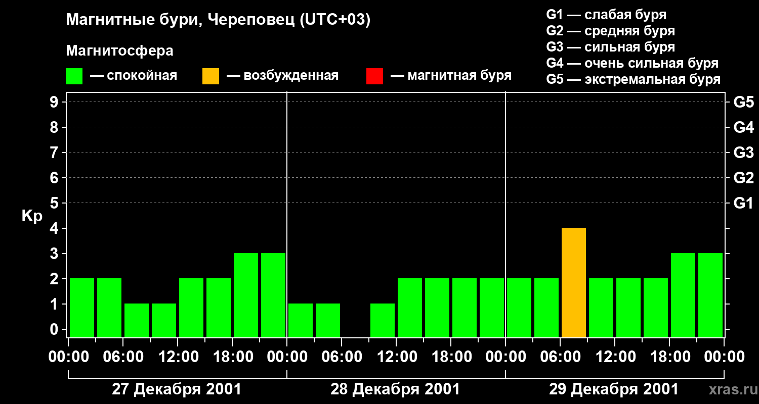 Изменения геомагнитного индекса Kp с 27 по 29 декабря 2001 года для средних широт