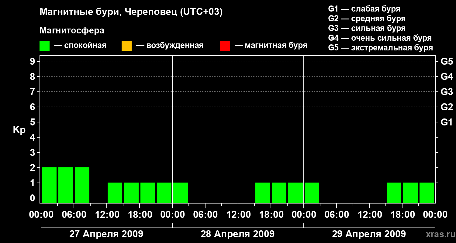 Изменения геомагнитного индекса Kp с 27 по 29 апреля 2009 года для средних широт