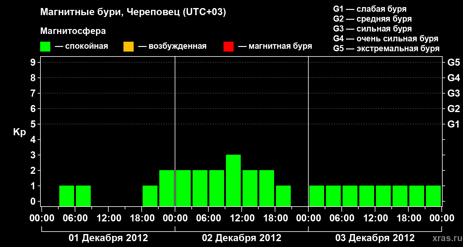 Изменения геомагнитного индекса Kp с 1 по 3 декабря 2012 года для средних широт