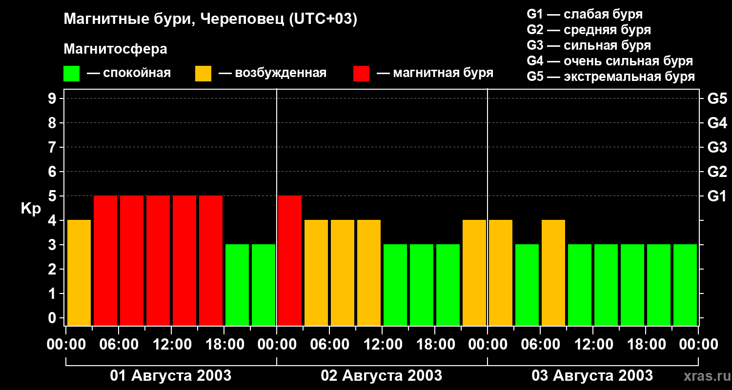 Изменения геомагнитного индекса Kp с 1 по 3 августа 2003 года для средних широт
